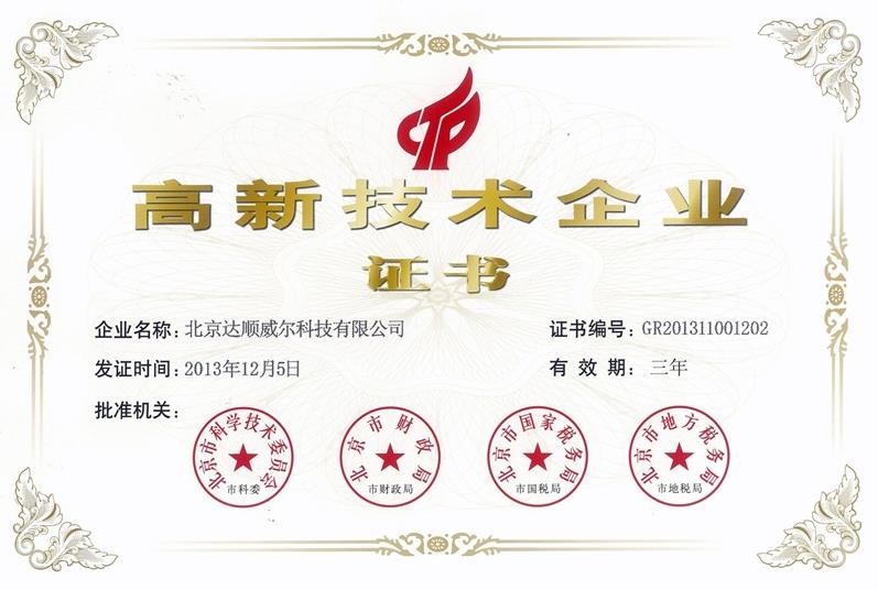 After the review of Beijing Municipal Commission of science and technology, we are hereby awarded the title of "high tech enterprise" and issued a certificate.